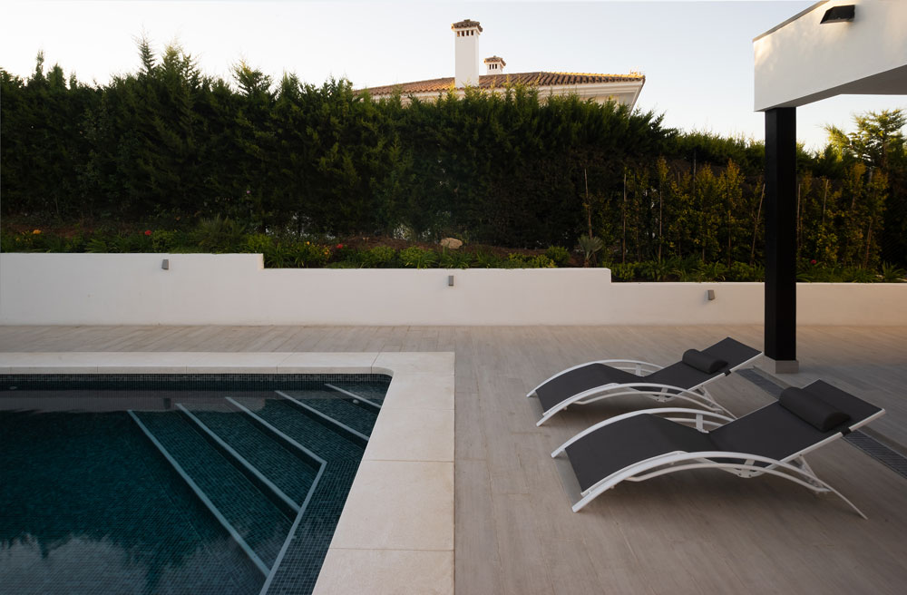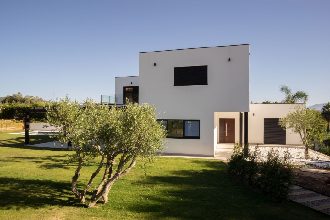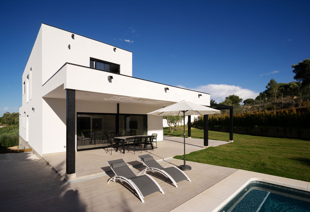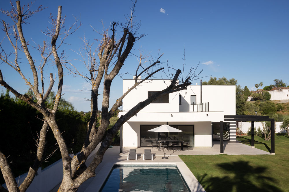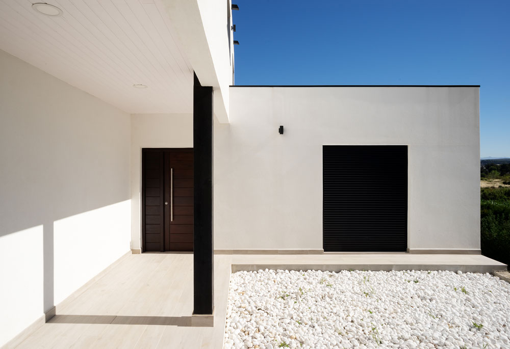 Exteriormente terminada en sate blanco dotando a la vivinenda de un marcado caracter mediterraneo junto con la pergola negra.