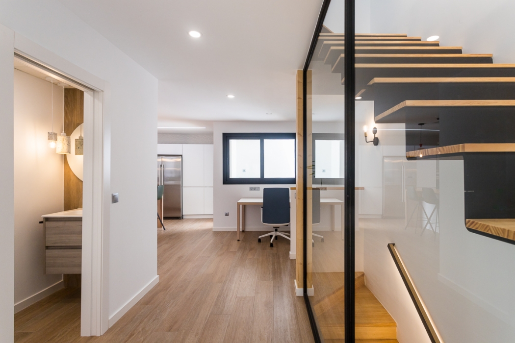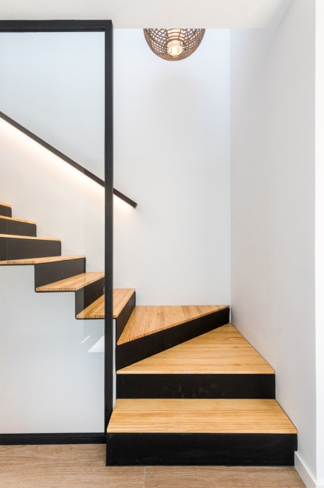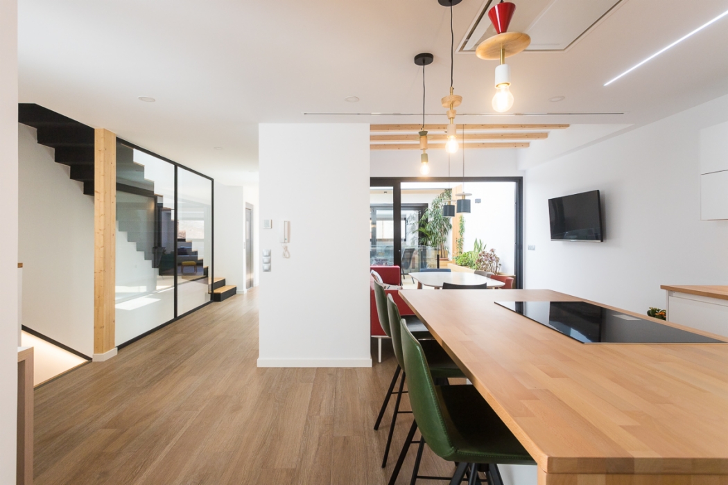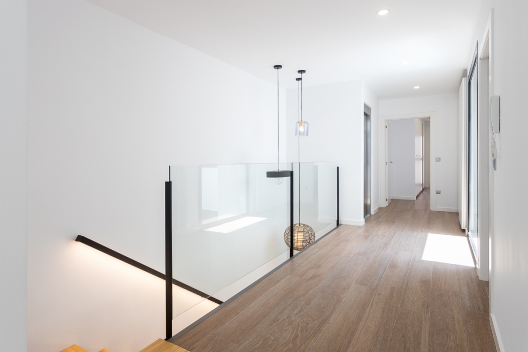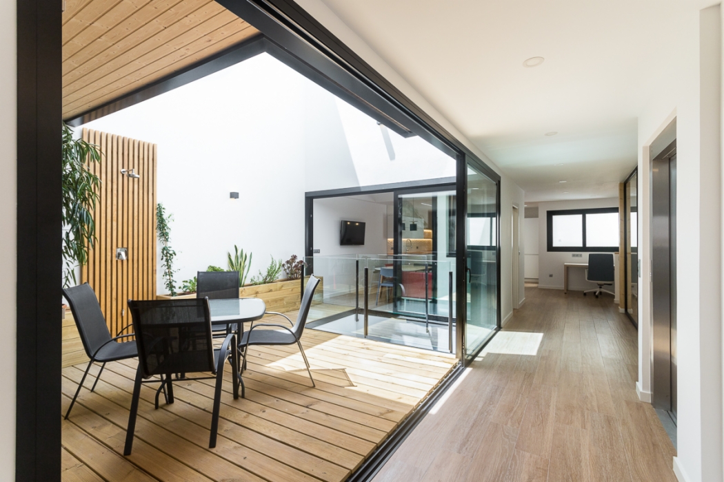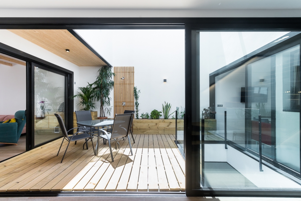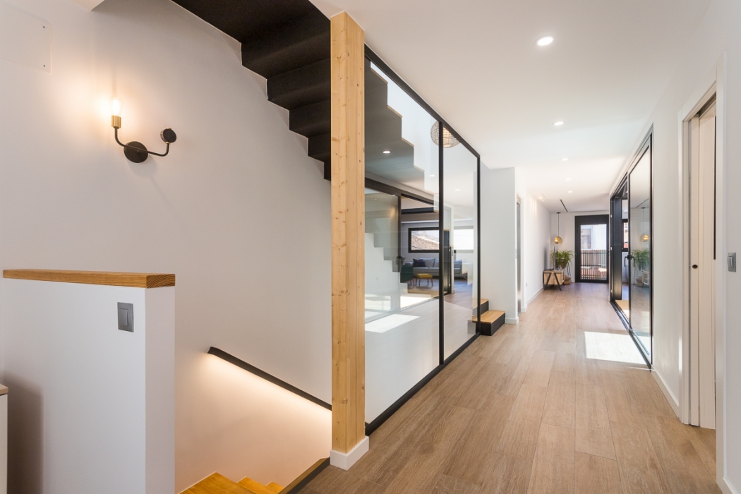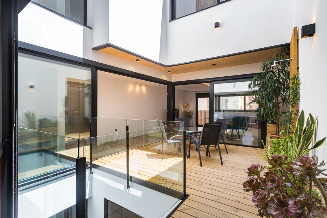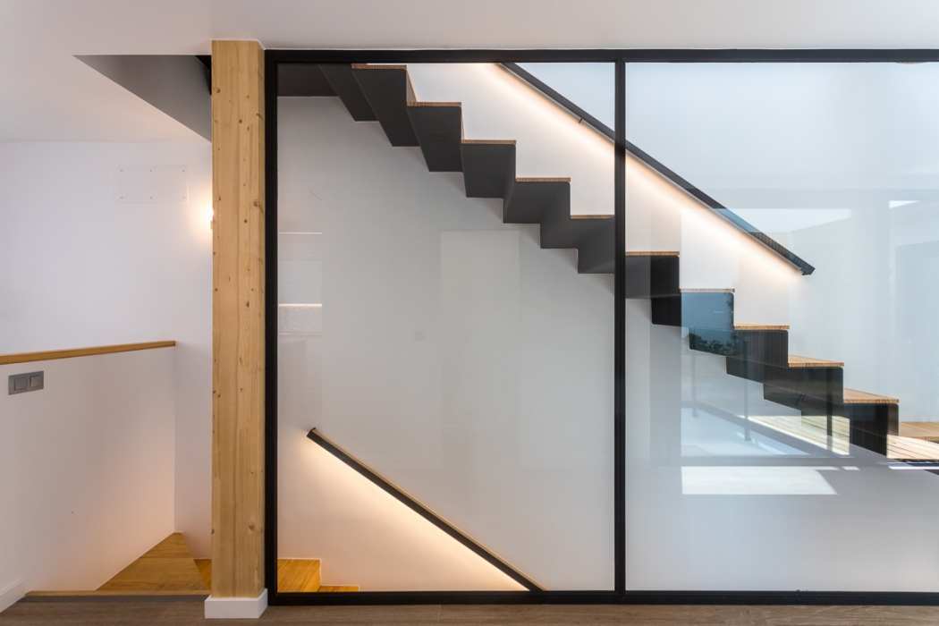 Vivienda de 300 m2 en tres plantas entre medianeras, con un diseño exterior moderno que combina la ceramica blanca con detalles de madera muy tipicos nuestros.